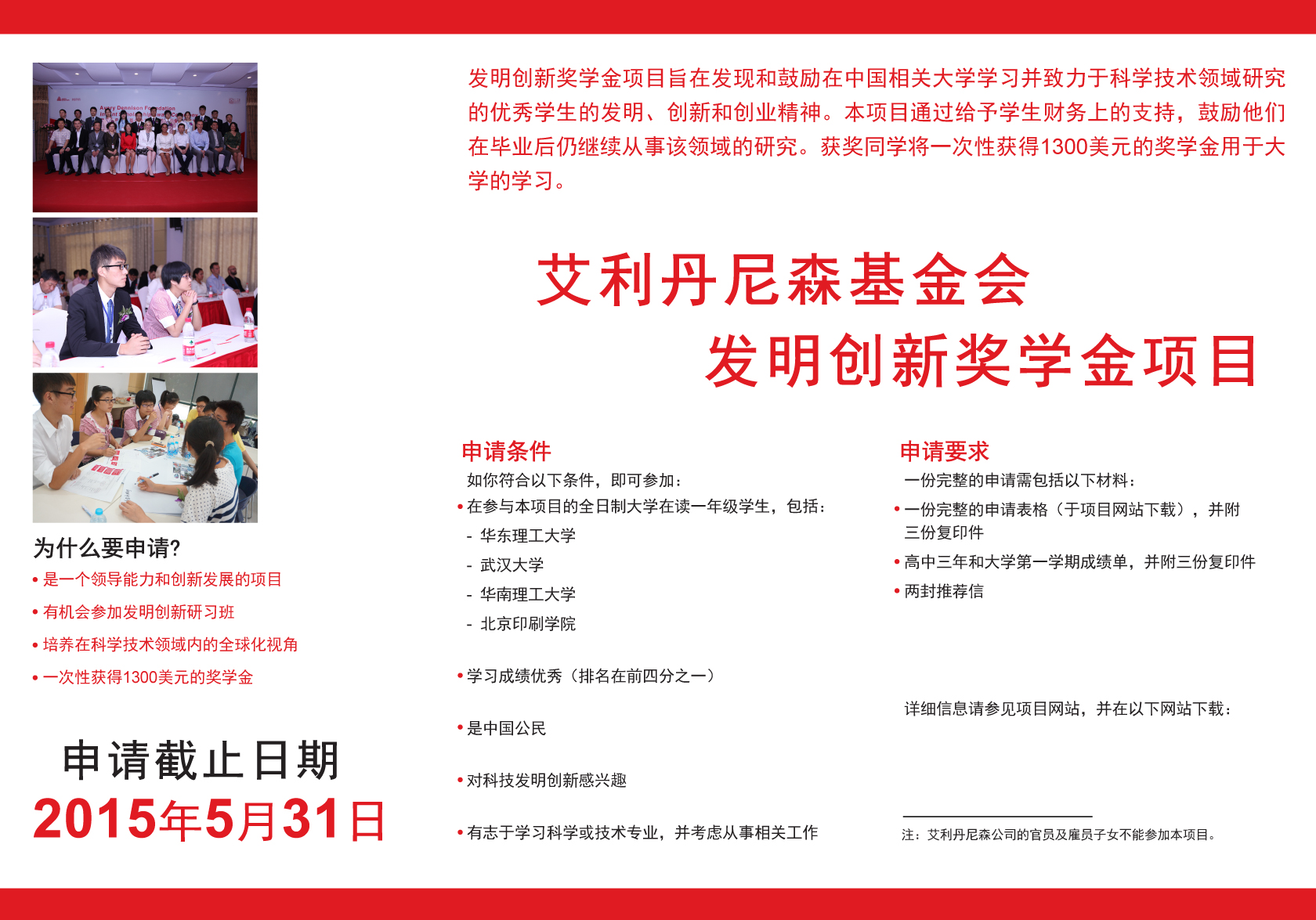 2015年艾利发明创新奖学金评选工作已经开始。请同学们踊跃报名!具体要求请看附件: