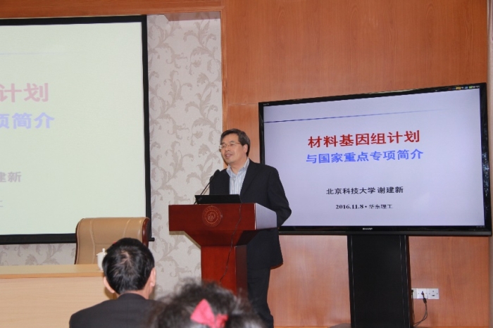 报告会上,谢建新介绍了材料基因组计划的背景和意义,阐述了该计划的内涵与战略目标。谢建新描绘了材料基因组计划国内外的发展现状和趋势,并着重指出国内外在机制、人才队伍以及研究水平和条件上的差距,鼓励与会师生关注并致力于实现材料基因组计划。随后谢建新通过典型案例解释了材料基因组计划的核心目标,即两个“一半”,或称双减半。最后,谢建新简单介绍了“材料基因工程关键技术与支撑平台”国家重点专项,其主要任务是完成3大平台建设、4大关键技术研发、5类材料验证性示范应用。