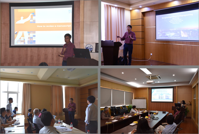 访问期间,Leong教授为澳门古天乐太阳集团官网师生带来了两场报告,分别为“Bioengineering of Direct Cellular Reprogramming”和“How to publish on Biomaterials”。报告会由刘昌胜主持。Leong教授首先介绍了直接细胞重编程技术。直接细胞重编程是指不经过中间干细胞的阶段,直接将成熟细胞从一个谱系经过重编程转化为另一个谱系,产生能应用于再生医学的细胞。它避免了药物及胚胎的使用,并最大限度地降低了将诱导的多功能干细胞应用于人体导致畸胎瘤形成的风险。它还可以产生用于疾病建模和药物筛选的细胞。随后,Leong教授介绍了目前他们的团队通过直接细胞重编程技术将人内皮祖细胞(hEPC)转化为诱导的平滑肌细胞(iSMC),将hEPC转化成诱导的骨骼肌细胞(iSkM),以及将人成纤维细胞转化成诱导的心肌细胞样细胞(iSML),并将小鼠成纤维细胞转化成诱导的神经元。在第二场报告中, Leong教授针对如何撰写学术文章以及文章投稿、审稿等大家关心的话题作了详细介绍。