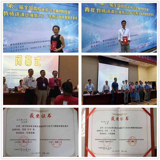 9月22日至24日,第二届“全国高校无机非金属材料专业青年教师讲课比赛暨教育部无机非金属材料专业教学指导委员会2017年会”在武汉理工大学举办。太阳集团官网澳门古天乐太阳集团官网无机系无机非金属材料工程专业的青年教师在此次全国授课大赛中斩获佳绩。孙金煜老师和毛荐老师分获此次大赛的特等奖和二等奖。