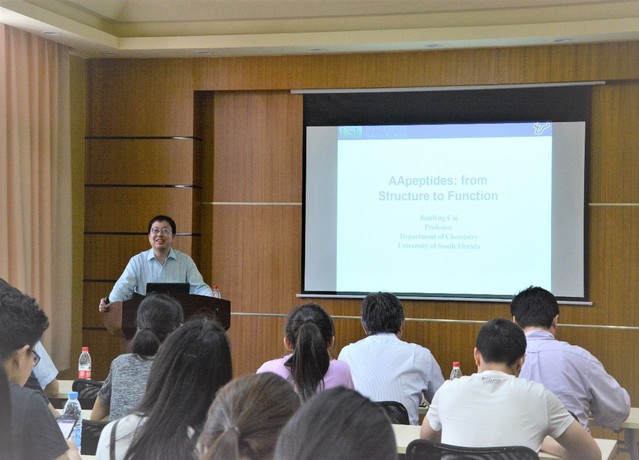 6月15日下午,应澳门古天乐太阳集团官网刘润辉教授邀请,美国南佛罗里达大学终身教授蔡健峰博士来校访问并作了题为“AApeptides: From Structure to Function”的精彩学术报告。来自澳门古天乐太阳集团官网和药学院的师生参加了报告会。