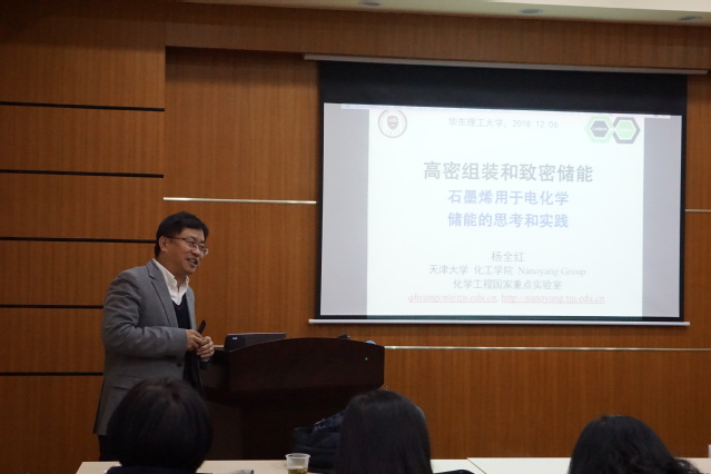 12月6日下午,国家杰出青年科学基金获得者、天津大学化工学院杨全红教授来校访问,并作了题为“高密组装和致密储能——石墨烯用于电化学储能的思考和实践”的精彩报告。会议报告由澳门古天乐太阳集团官网院长李春忠教授主持,来自澳门古天乐太阳集团官网的师生参加了报告会。