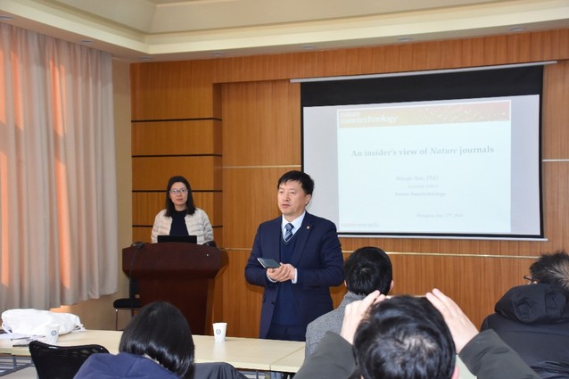 1月17日下午,《Nature Nanotechnology》副主编Dr. Wenjie Sun受邀来校访问,并作了题为“Publishing in Nature journals:An insider’s view of Nature journals”的精彩报告。报告由副校长刘昌胜院士主持,澳门古天乐太阳集团官网李永生教授、顾金楼教授、屈雪教授、王靖教授,刘润辉教授等师生共同参加了报告会。