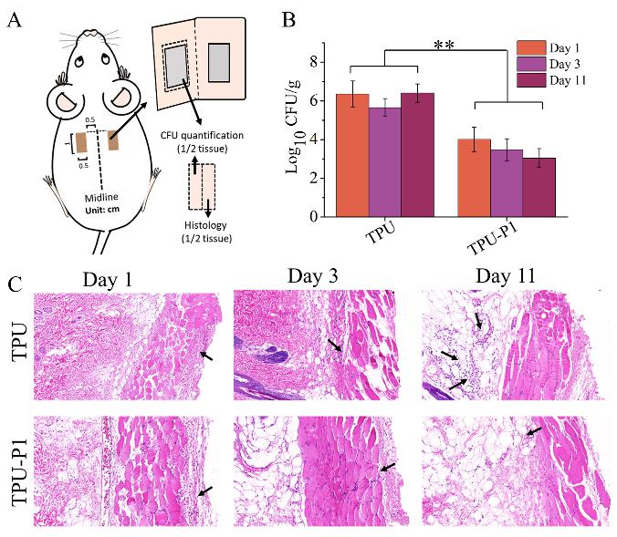 (A) 皮下植入示意图,(B) Day 1, Day 3, Day 11体内抗菌活性, (C) Day 1, Day 3, Day 11 体内皮下植入组织学HE染色。
