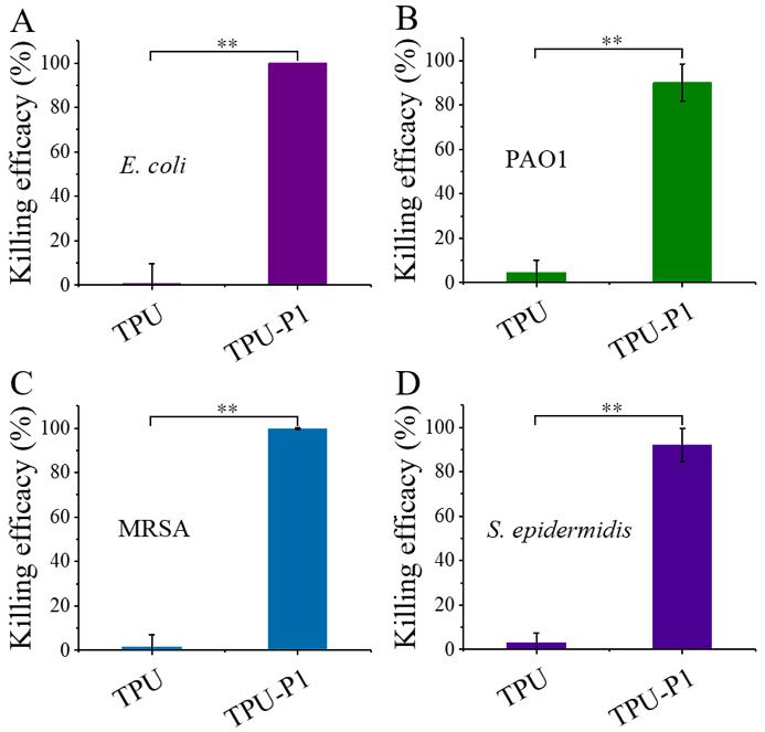 图2. β多肽聚合物修饰的聚氨酯表面抗菌活性