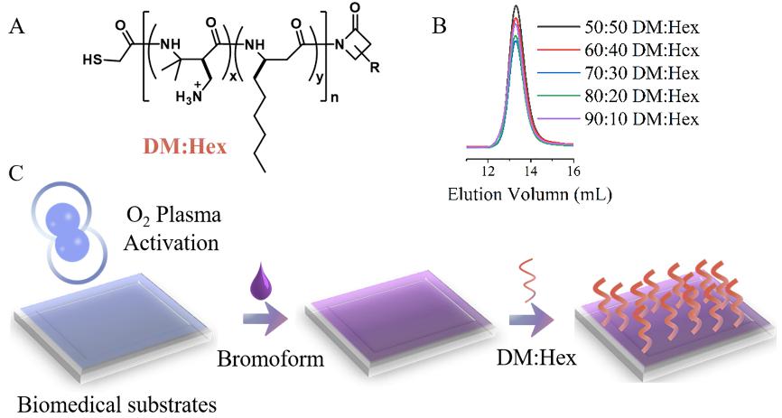 图1. β多肽聚合物的合成以及医用基材表面接枝聚合物