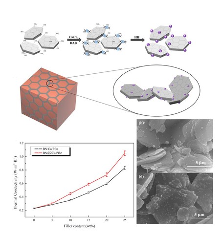 近日,太阳集团官网澳门古天乐太阳集团官网吴唯教授课题组通过金属与陶瓷颗粒的设计、合成与组装,成功制备了新型杂化导热填料。这类填料在聚合物中构建导热网络的能力获得大幅提升,能够显著提高聚合物材料的导热性能,具有重要价值。研究工作以“Highly thermally conductive polybenzoxazine composites based on boron nitride flakes deposited with copper particles”为题,在线发表在国际著名期刊《Materials & Design》上。