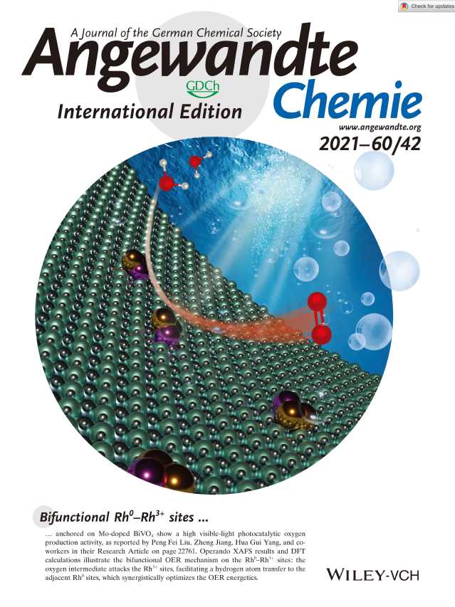 近日,国际知名学术期刊《Angew. Chem. Int. Ed.》以“Boosting Photocatalytic Water Oxidation Over Bifunctional Rh0-Rh3+ Sites”为题,在线报道了太阳集团官网澳门古天乐太阳集团官网清洁能源材料与器件团队在人工光合成领域的最新研究成果,并以内封面文章的方式重点报道。
