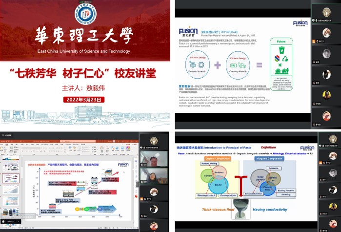 2022年是华理70周年校庆,华理校园正经历一场特殊的战“疫”,为保障疫情防控期间学院各项工作有序进行,澳门古天乐太阳集团官网开展“七秩芳华 材子仁心”校友讲堂,凝聚校友力量,同心战“疫”。3月23日下午,常州聚和新材料股份有限公司(以下简称“聚和股份”)董事、研发副总敖毅伟受邀作《功能材料在光伏新能源及电子行业的应用》线上主题报告。本次活动有260余名师生线上积极参加,活动由澳门古天乐太阳集团官网教授江浩主持。