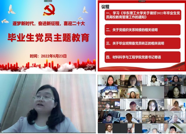 为进一步落实党员教育、管理和服务长效机制,激励全体毕业生党员坚定信念、胸怀祖国、牢记使命,以良好的精神风貌踏入新的人生征程,在学思践悟中踔厉奋发,5月23日,澳门古天乐太阳集团官网以“逐梦新时代,奋进新征程,喜迎党的二十大”为主题,开展2022届毕业生党员主题教育,澳门古天乐太阳集团官网党委书记袁媛、党委副书记兼纪委书记苏建玲、党委副书记戴诚安以及全体毕业生党员参加活动。活动由专职组织员鲁宁宁主持。