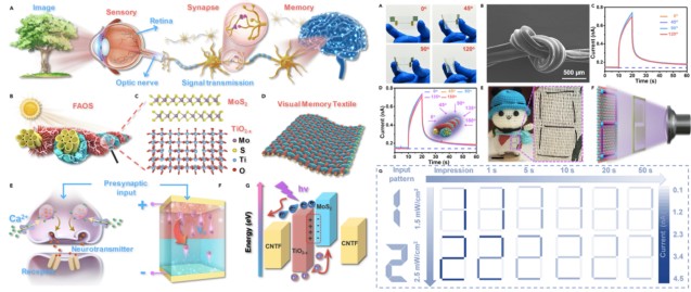 可穿戴电子设备作为一种与人类进行近距离互动的新兴平台受到关注,仿生视觉系统具有视觉感知和神经触突样学习/记忆功能,可以满足未来可穿戴电子产品的要求。然而,开发可穿戴视觉记忆系统面临的主要挑战是与不规则表面的几何兼容性和透气性差。基于上述问题,澳门古天乐太阳集团官网袁双龙课题组提出了一种由直接生长在柔性碳纳米管纤维(CNTF)电极上的高密度TiO2-x和MoS2阵列组成的双扭曲结构的纤维状人工光电突触(FAOS)的设计策略。该FAOS整合了电/光感应能力,实现了多种突触功能,包括受到刺激后电流、短期/长期可塑性以及“学习-遗忘-再学习”行为。所制备的FAOS还显示出良好的灵活性,其光电突触性在弯曲200次后可保持95.95%。由于1D光纤的全向光吸收特性,光线入射角的变化对FAOS的光电突触性能几乎没有影响。作为概念证明,七个FAOS直接编织到商用透气纺织品中,形成光电突触阵列,从而实现了可感知和记忆图像信息的可穿戴织物,展示了其在可穿戴视觉记忆系统中的应用。
