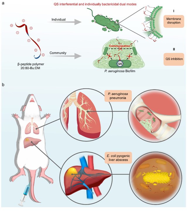 细菌性感染病,如细菌性肺炎和化脓性肝脓肿,在历史上具有较高的发病率和死亡率,对人类的生命安全构成了严重威胁。而随着耐药菌的出现,常规抗生素的治疗效果下降,使细菌感染成为一个更加严峻的挑战。因此,迫切需要新的抗菌策略来解决这一难题。在本研究中发现,模拟宿主防御肽的优选β−多肽聚合物通过群体感应干扰和细菌膜破坏双重作用机制发挥抗菌效果,经过验证对细菌性肺炎和化脓性肝脓肿都有良好的治疗效果,实验结果表明该新型β−多肽聚合物具有良好的临床转化前景。