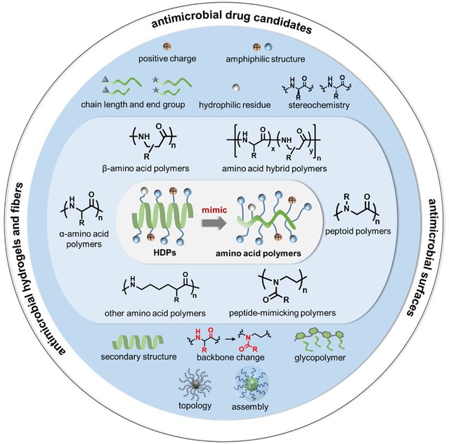 本评述论文结合刘润辉教授课题组在本领域的系统研究成果,综述了过去十年中关于HDP模拟抗菌氨基酸聚合物及其类似物的最新进展研究,这些聚合物包括α-氨基酸聚合物、β-氨基酸聚合物、类肽聚合物、氨基酸杂化聚合物和肽模拟聚合物等,全面概述了抗菌氨基酸聚合物的结构设计和主要抗菌应用,包括正电荷、两亲性结构、链长、端基、亲水性、立体化学、二级结构、拓扑结构、自组装和骨架结构等,并提出了抗菌氨基酸聚合物领域在抗耐药菌和治疗微生物感染领域未来的机遇和仍需要解决的挑战。