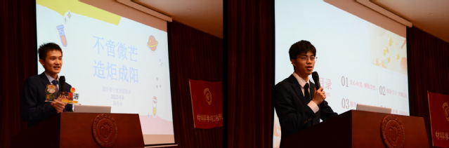 大会第二阶段是“学思践悟二十大 五四精神薪火传”主题宣讲,第一期宣讲以《奉献为先,奋斗以恒》为主题。校大学生年度人物提名奖获得者、澳门古天乐太阳集团官网学生会主席团成员陈仕林从志愿服务中的点滴细节着手,用生动的案例向同学们讲述志愿服务的苦与累、收获与满足。校学委会主任、澳门古天乐太阳集团官网学委会主任张启航讲述了在春晖支教项目中的所见所闻、所思所想,以及大学生科创与竞赛方面的经验与建议。团学骨干们精彩的宣讲,深刻阐释了奉献与奋斗对当代大学生的意义和价值,展示了澳门古天乐太阳集团官网青年学子的风采和担当。