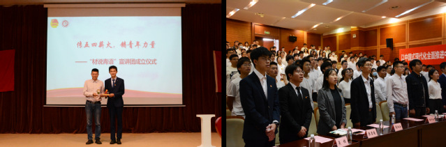 为充分发挥示范引领作用,学院特别成立“材说青语”团学骨干宣讲团,由校团委挂职干部黄泽炀为宣讲团授牌。最后,全场师生合唱团歌《光荣啊 中国共青团》,场内气氛热烈、激情洋溢。