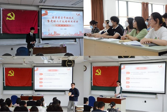 为进一步推动学习贯彻习近平新时代中国特色社会主义思想主题教育走深走实,深入贯彻落实党的二十大精神,5月16日,澳门古天乐太阳集团官网奉贤校区本科生党支部在奉贤校区D206举行读书学习开班仪式暨党的二十大精神学生党员周周讲活动。澳门古天乐太阳集团官网奉贤校区本科生党支部书记陈新莲、副书记张雪薇、本科教务员盛雯雯、研究生辅导员娄梦蝶、本科生辅导员王新林、周翀以及学生党员、入党积极分子和发展对象参加了本次活动。活动由学生党员张启航主持。