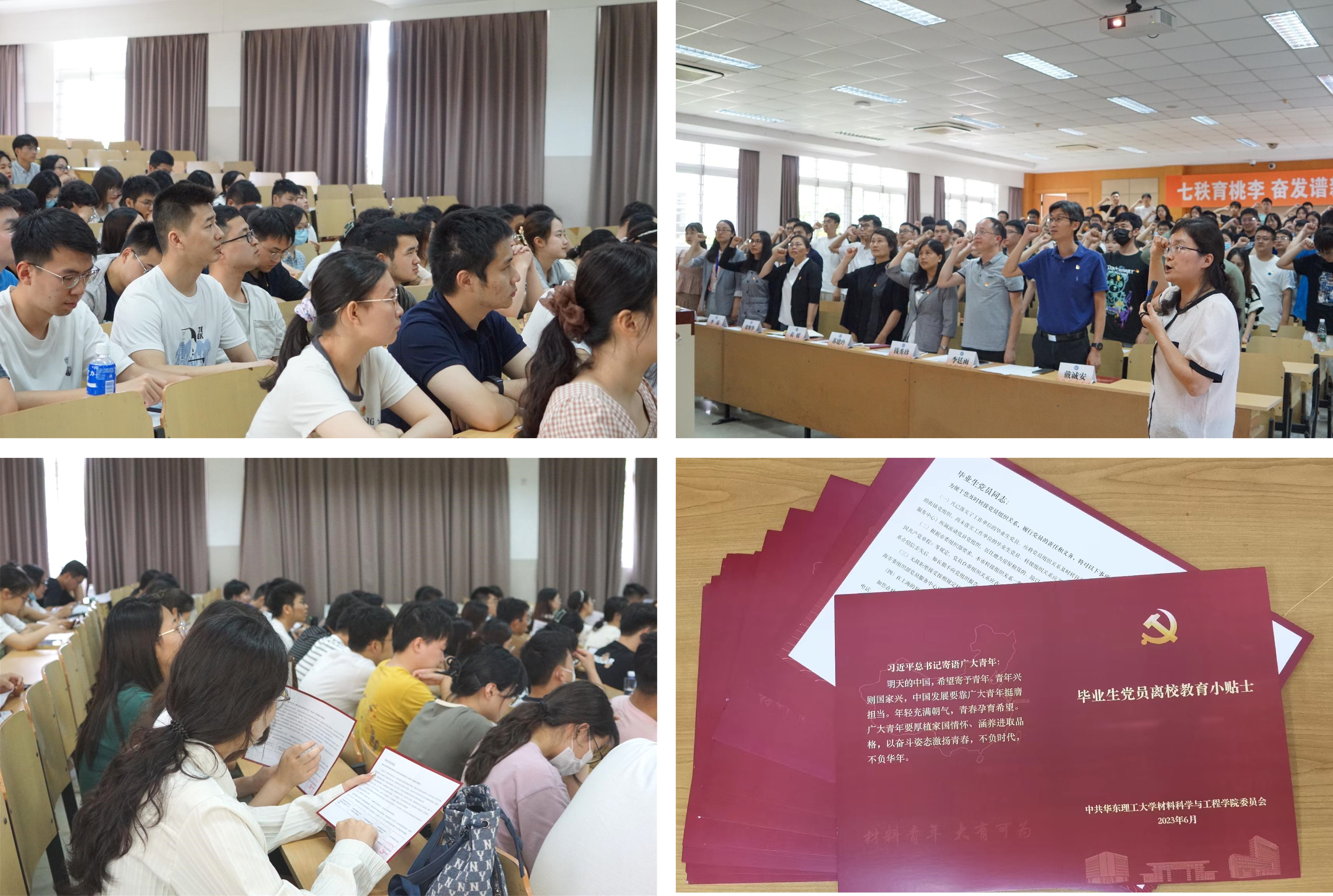 为深入开展学习贯彻习近平新时代中国特色社会主义思想主题教育,引导和鼓励毕业生党员坚定理想信念,以良好的精神风貌踏入新的征程68日中午,澳门古天乐太阳集团官网在徐汇校区八教107召开2023毕业生党员离校教育大会。材料学院党委书记袁媛、党委副书记兼纪委书记苏建玲、党委副书记戴诚安、专职组织员、本研辅导员、党建兼职辅导员及全体毕业生党员参会。会议由戴诚安主持。