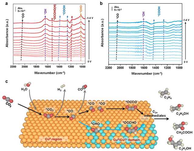 电化学CO2还原技术对于实现碳循环,缓解能源和环境问题具有重要意义,也是助力“双碳”目标的理想途径之一。CO2还原涉及多个质子耦合电子转移过程,其产物分布宽、选择性差;相比于单碳产物(C1产物,如CO、HCOOH、CH4、CH3OH),多碳产物(C2+产物,如C2H4、C2H5OH、CH3COOH等)具有更高的能量密度和经济价值。然而,生成C2+产物需要经历动力学缓慢的C-C偶联过程,其反应机制研究和反应路径调控仍十分具有挑战。