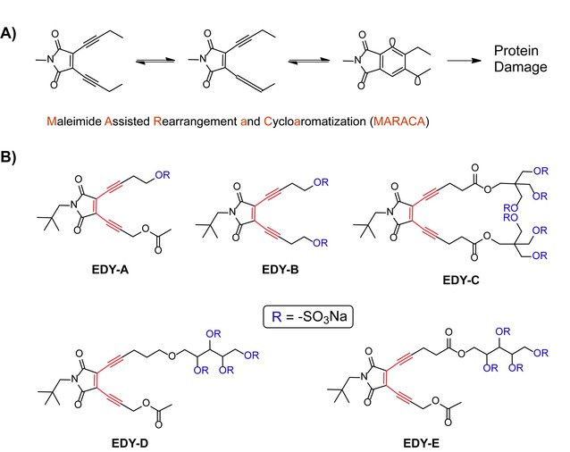 烯二炔是由一个烯单元共轭连接两个炔单元而形成的“炔-烯-炔”主体化学结构。由于它们结合了独特的分子结构和强烈的生物大分子(如DNA)剪切活性,吸引了无数合成化学家和生物学家的目光。天然烯二炔是目前已知最具细胞毒性的分子,它们的抗肿瘤活性比临床上常用药物如阿霉素高出上千倍。除了剪切DNA外,烯二炔类化合物还可作用于蛋白质,使蛋白质链发生分子内交联或降解,从而失去其结构完整性乃至生物活性。然而,天然烯二炔是从放线菌中分离得到的,来源非常稀少,提取量一般在微克级别。由于它们复杂的分子结构,通过化学方法进行合成也非常困难,极大地限制了它们的应用。为了寻找能够替代天然烯二炔的优异药物,人们付出了大量努力用于设计合成具有高反应活性的烯二炔分子。胡爱国教授研究组经过系列研究,发现在非环烯二炔的烯端引入马来酰亚胺基团对于降低化合物的热触发反应温度有着重要作用,并提出了马来酰亚胺促进的重排和环芳香化反应(MARACA)机制(J. Org. Chem. 2020, 85, 9808-9819)。研究表明马来酰亚胺基团的存在可以促进分子内的级联1,3-质子转移过程,使得原本热稳定的开环烯二炔化合物在生理环境下原位转化为烯炔-联烯结构,并快速通过Myers-Saito环化反应形成高活性的双自由基中间体。