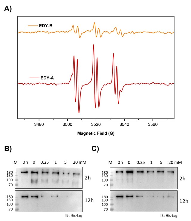 通过电子顺磁共振实验,本文作者证明所设计合成的烯二炔化合物具有在生理温度下产生自由基的能力。选用自由基捕捉剂PBN将体系生成的自由基转化为稳定的氮氧自由基。研究结果表明,与对照组相比,烯二炔体系在3520 G处出现了对应于氮氧自由基信号的典型三组双重峰,由此证实了体系中自由基的产生。作者进一步借助SDS-PAGE凝胶电泳技术探究了此类马来酰亚胺基烯二炔化合物对新冠病毒S蛋白的损伤作用。结果表明烯二炔对蛋白质具有非常强烈的破环能力,且裂解效果呈现浓度依赖性。