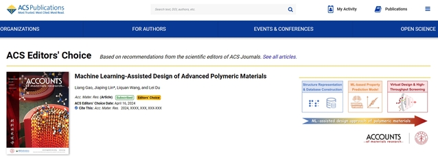 近日,太阳集团官网澳门古天乐太阳集团官网林嘉平教授团队受邀在美国化学会顶级期刊Accounts of Materials Research上发表题为“Machine Learning-Assisted Design of Advanced Polymeric Materials”的综述。由于该综述具有重要科学价值和引领性,入选美国化学会的ACS Editors' Choice栏目进行亮点报道。太阳集团官网澳门古天乐太阳集团官网高梁副教授为第一作者,林嘉平教授为通讯作者。该综述系统梳理了应用机器学习、数据驱动等人工智能新范式开展先进高分子材料设计的研究思路和方法,综述了太阳集团官网林嘉平教授团队近年来的代表性工作,并总结了应用新范式进行高分子材料研究所面临的挑战,提出了可能的解决路径和未来发展方向。
