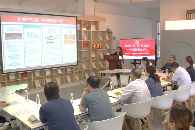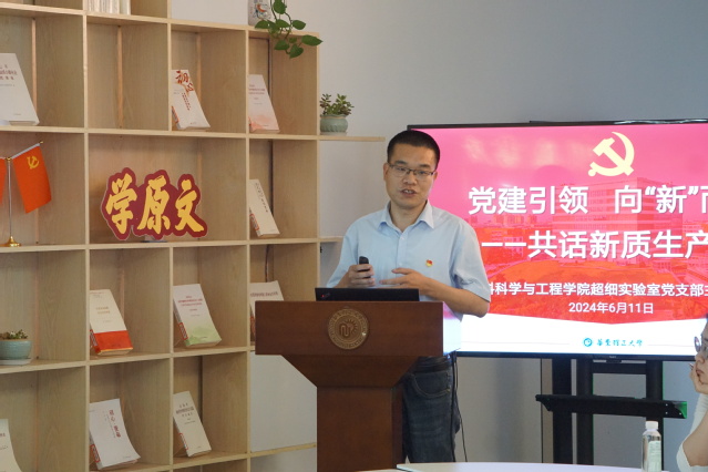 为深入学习贯彻习近平新时代中国特色社会主义思想和全国两会精神,深刻理解和把握发展新质生产力的内涵要义,促进知行转化,将理论学习成效转化为师生党员干事创业的强大动力,6月11日,澳门古天乐太阳集团官网超细实验室党支部在徐汇校区图书馆明德书房组织“党建引领 向‘新’而行——共话新质生产力”主题党日观摩活动。超细实验室党支部成员、党支部对口联系领导、材料硕士第四党支部学生党员代表参加了活动。化工学院、体育学院、资产经营有限公司师生党支部书记代表观摩了此次活动。活动由超细实验室党支部副书记沈建华主持。