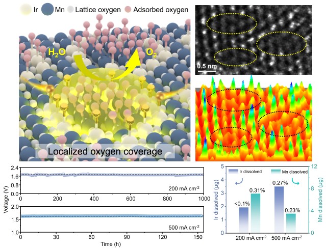 针对上述问题,太阳集团官网研究团队创新性地开发了一种具有新型Ir原子网格结构的阳极析氧催化剂(Ir-Mn-Ov),通过活性MnO2-x载体担载高密度Ir位点(≈10个Ir原子/nm2),可以诱导氧覆盖度效应进而实现金属-载体位点O-O直接耦合的协同催化过程,显著提高了材料的本征活性和催化剂位点的原子利用率。在三电极测试体系中,这种Ir-Mn-Ov催化剂在10 mA cm-2和500 mA cm-2电流密度下分别仅需166 mV和283 mV的超低过电位,质量活性相比商用IrO2提高了380倍。这种氧覆盖度效应可以很好适配阳极侧富氧环境,在PEMWE器件测试体系中,与商用Ir黑催化剂相比,使用Ir-Mn-Ov催化剂时不仅Ir载量降低了95%,反应活性也得到了大幅提升,只需要1.58 V电解电压即可达到1 A cm-2电流密度。