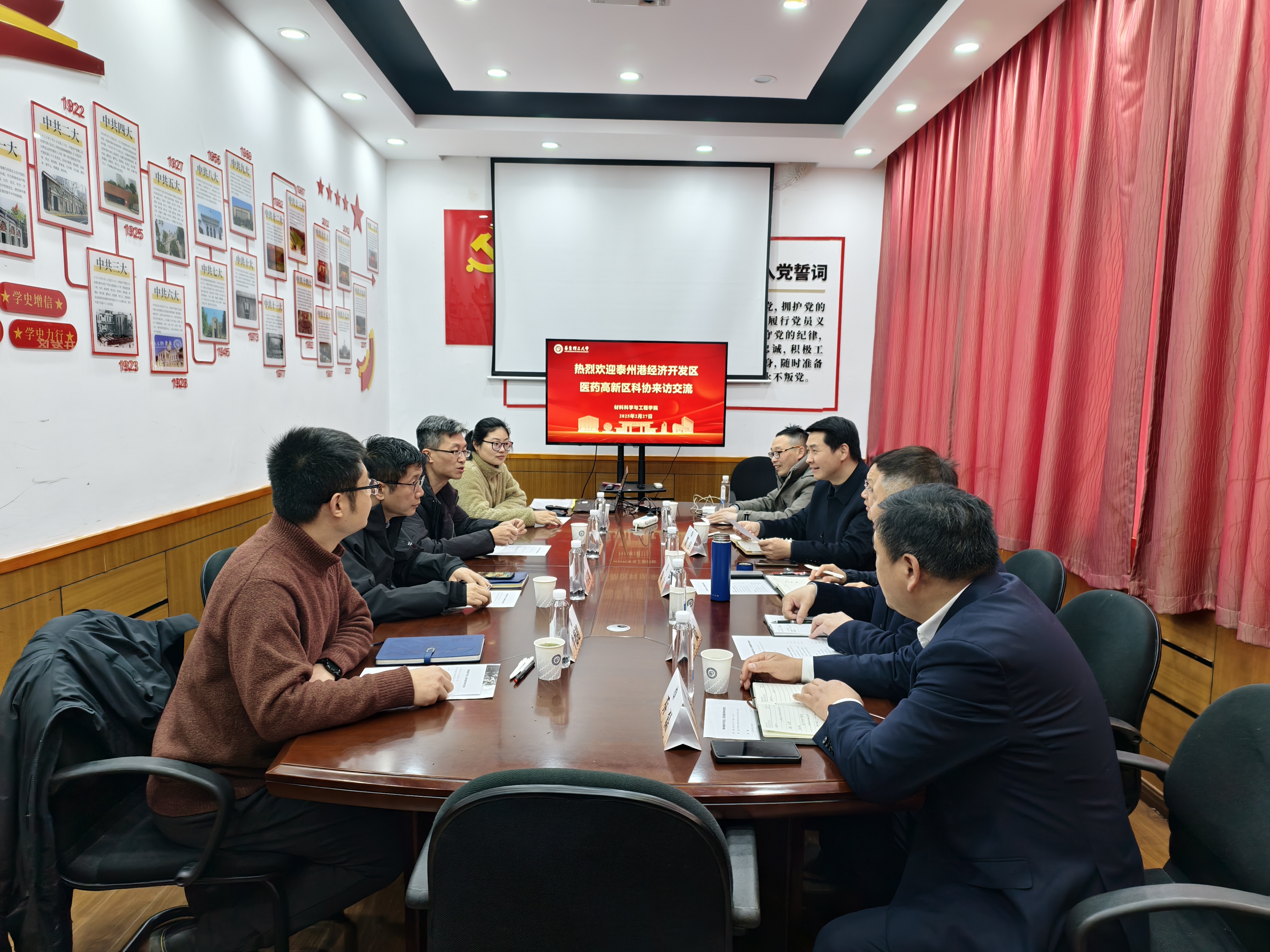 2月27日,江苏泰州港经济开发区管理办公室党工委委员陶立、泰州医药高新区科协副主席乔磊一行5人来访澳门古天乐太阳集团官网,在实验一楼第二会议室开展座谈交流。太阳集团官网科学技术发展研究院副院长庄启昕,澳门古天乐太阳集团官网党委副书记戴诚安、院务助理牛德超、就业指导教师陈新莲参加座谈。会议由戴诚安主持。
