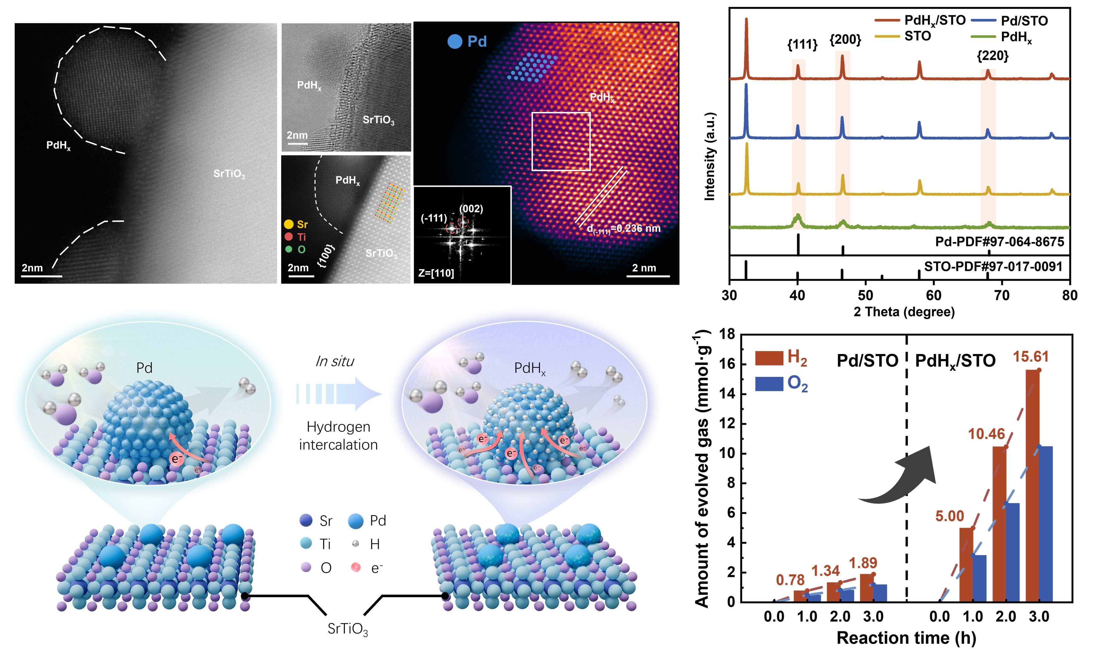 针对这一关键问题,太阳集团官网澳门古天乐太阳集团官网清洁能源材料与器件团队选取钛酸锶(SrTiO3, STO)作为半导体光催化材料,通过在STO表面定向锚定晶格匹配的Pd纳米团簇作为助催化剂,进一步通过原位注氢手段可控构建出PdHx活性结构。PdHx/STO的光催化体系展现出优异的光分解纯水制氢性能,其氢气析出速率高达5 mmol·g-1·h-1,较未注氢前的Pd/STO提升6.4倍。