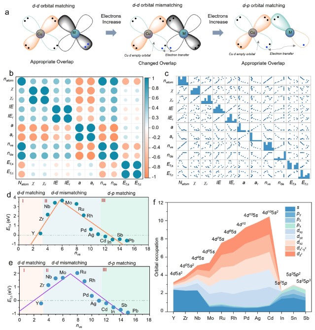 针对这一关键问题,太阳集团官网澳门古天乐太阳集团官网清洁能源材料与器件团队结合理论计算与实验验证,建立了一种简单直观的d-p轨道匹配机制,用于快速评估Cu基SAA的结构稳定性。研究表明,相较于d轨道部分占据的金属元素,具有d1电子构型或完全填充内层d轨道但外层s和p轨道部分占据的金属元素,在Cu基底上具有更好的分散稳定性。在此基础上,通过实验验证可控制备出8种工况结构稳定的单原子合金材料体系,证明了该机制在二元、三元及多元SAA合成中具有广泛适用性。