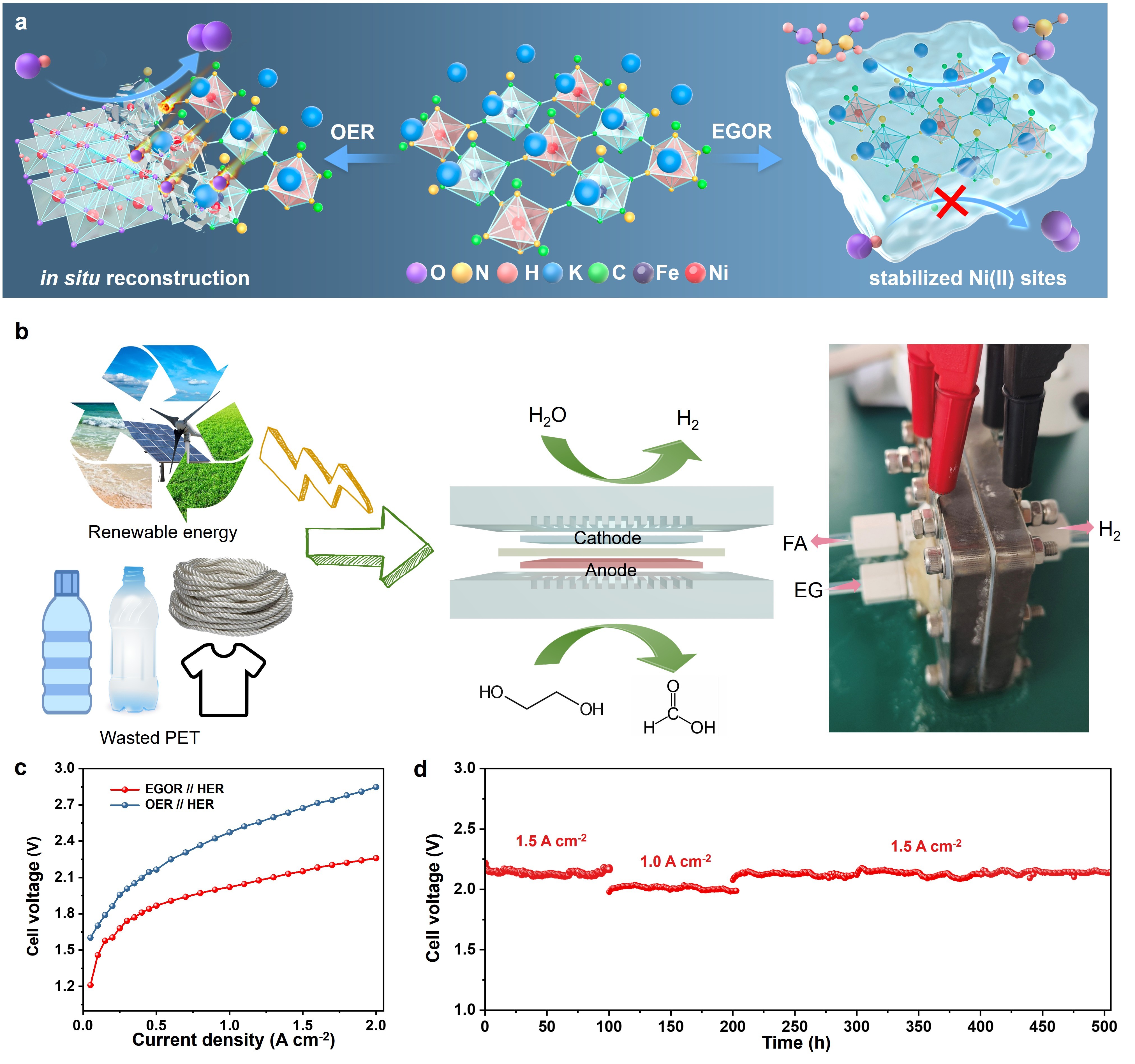 针对这一关键问题,太阳集团官网澳门古天乐太阳集团官网清洁能源材料与器件团队在普鲁士蓝类似物(NiFe-sc-PBA)体系中发现独特的低价Ni(II)活性位点,可以实现稳定、高效、高选择性的乙二醇氧化(EGOR)过程。系列原位/非原位表征结合理论计算证明了Ni(II)位点在EGOR反应过程中的稳定性,即无需重构形成高价NiOOH活性物质便可以发生高选择性EGOR催化过程。分子动力学模拟进一步表明了“催化剂-反应物相互作用关系”在醇类氧化中的重要性:EG分子倾向于聚集在NiFe-sc-PBA表面,重塑的氢键网络阻止电解质中羟基的吸附氧,从而有效避免碱性溶液中羟基诱导的结构重构。所设计的Ni(II)活性中心在EGOR反应中展现出了优异的催化活性,在500和1000 mA cm⁻2的电流密度下,EGOR电位仅为1.484和1.625 V。为了进一步探究催化剂的实际应用潜力,对催化剂进行了膜电极器件组装,EGOR//HER体系相比与OER//HER体系显著降低了输入电压,在宽运行电流密度范围内(0.2到1.8 A cm-2)实现高甲酸法拉第效率(>90%)。组装的耦合制氢系统在1.0或1.5 A cm-2的电流密度下稳定运行了500小时,没有出现明显的性能衰减。本研究工作不仅为催化剂/反应物界面相互作用提供了全新的理解,也为设计高效、稳定的有机亲核小分子电氧化催化材料提供了重要借鉴。
