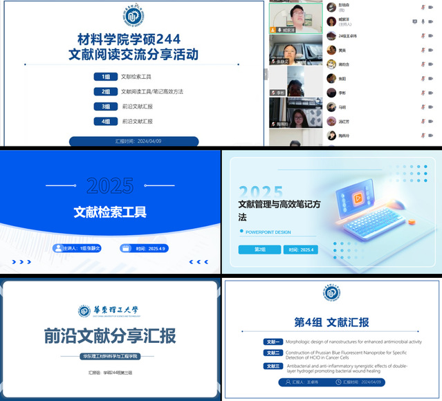 4月9日,同学们以“文献阅读交流分享”为主题,围绕科研学习中的关键能力进行了系统交流。全体成员分为四组,从不同维度分享学术经验。第一组聚焦“文献检索方法”,讲解如何高效使用数据库与关键词定位学术论文;第二组介绍“文献管理与笔记整理”的技巧,强调了良好科研习惯的重要意义;第三、第四组则结合各自研究方向,围绕前沿文献进行了深入解读与汇报。整个汇报过程中,同学们认真聆听,积极提问,现场学习氛围浓厚。本次交流不仅拓宽了同学们的科研视野,更有效提升了专业技能,增强了学术自信。