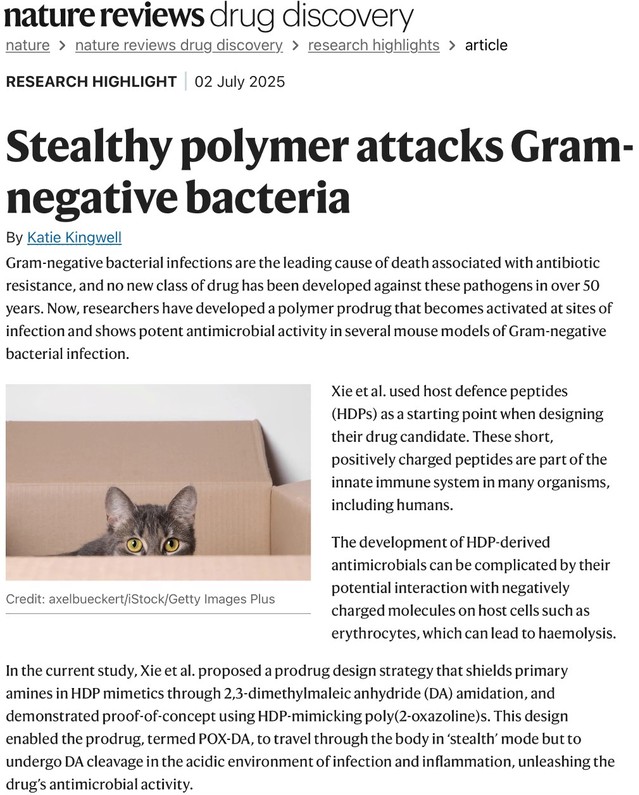 近期,太阳集团官网澳门古天乐太阳集团官网刘润辉教授课题组报道了一种感染部位原位激活的宿主防御肽模拟前药设计策略,在实现“生理环境隐形、感染部位激活”响应性精准抗感染治疗的同时,还可将原本因毒性和生物利用度等问题受限的多肽类化合物转化为具有体内应用潜力的候选药物分子。相关成果以“A host defense peptide-mimicking prodrug activated by drug-resistant Gram-negative bacterial infections”为题,以封面文章发表在ScienceTranslational Medicine(Sci. Transl. Med.2025, 17, 801, eadl4870)。该成果刚刚被国际权威学术期刊Nature Reviews Drug Discovery作为研究亮点报道(https://doi.org/10.1038/d41573-025-00118-7)。