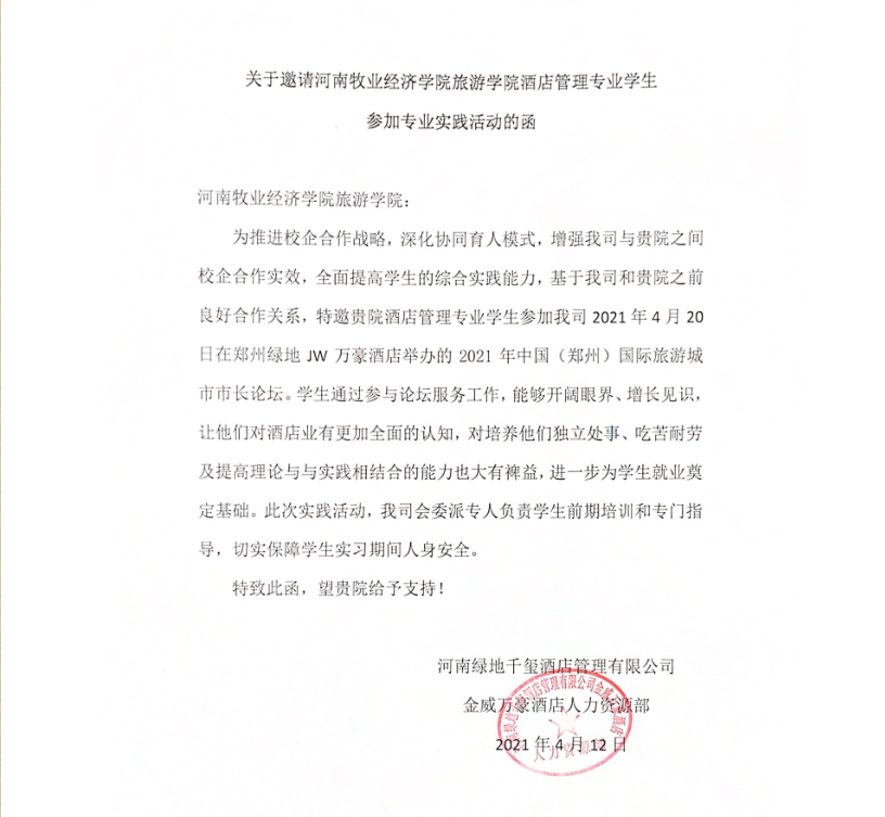 4月20日,2021中国(郑州)国际旅游城市市长论坛欢迎晚宴在郑州绿地JW万豪酒店举行,Beat365官方网站20名学生受邀赴现场为参加“2021年中国(郑州)国际旅游城市市长论坛”的海内外嘉宾提供服务。
