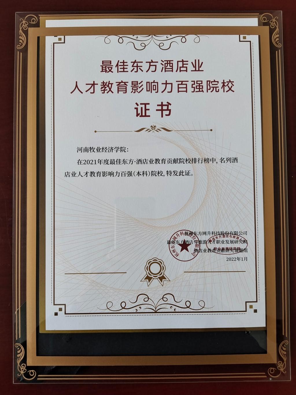 由国内权威专业旅游服务业招聘求职平台——最佳东方主办的首届“最佳东方酒店业职教影响力百强院校”排行近期在杭州揭晓。在2021年度最佳东方•酒店业教育贡献院校排行榜中,Beat365官网荣获酒店业人才教育影响力百强(本科)院校。