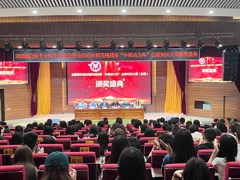 9月21日,全国商业精英挑战赛“中展动力杯”会展知识大赛(校赛)颁奖典礼在Beat365官网龙子湖校区教学楼合100学术报告厅举行,Beat365官方网站院长王德静、副院长王中雨、河南中展动力展览有限公司总经理宋传强、运营总监魏丽、会展经济与管理教研室全体教师、2023级会展经济与管理专业全体学生和所有获奖人员200多人参加颁奖,活动由会展经济与管理专业负责人连建功主持。