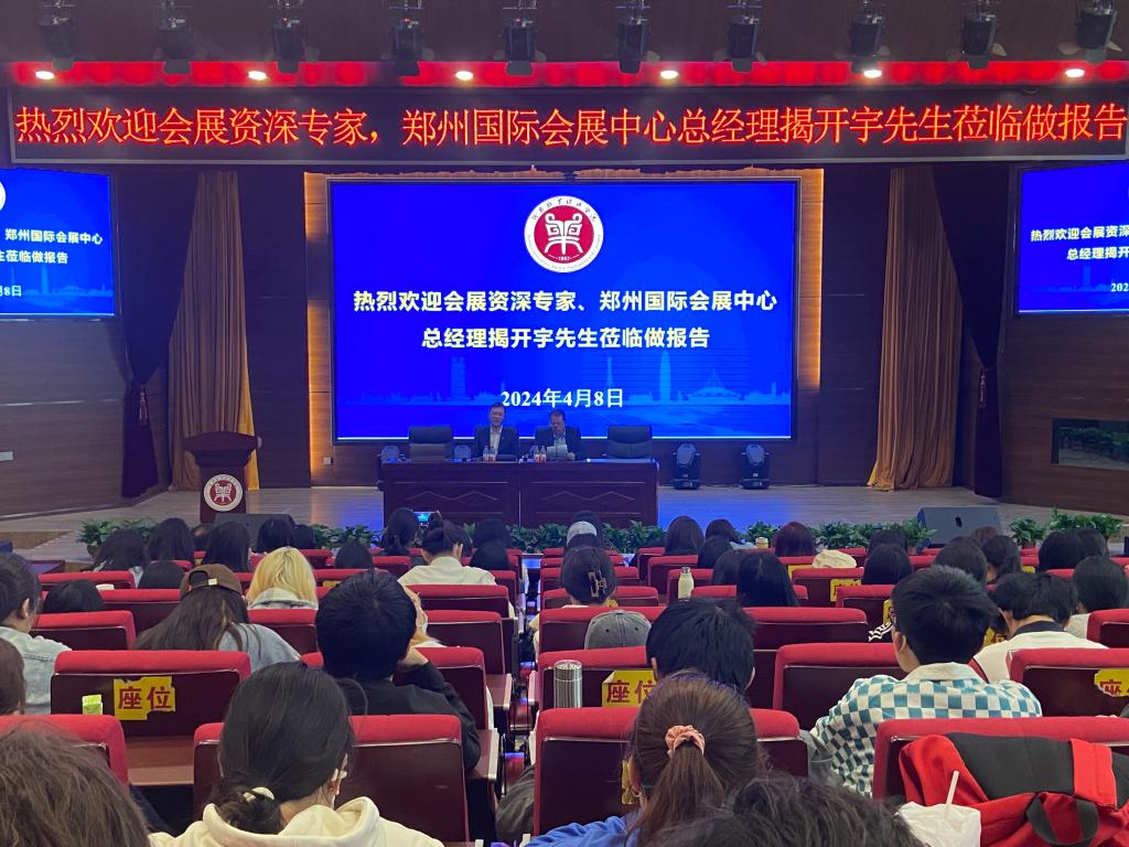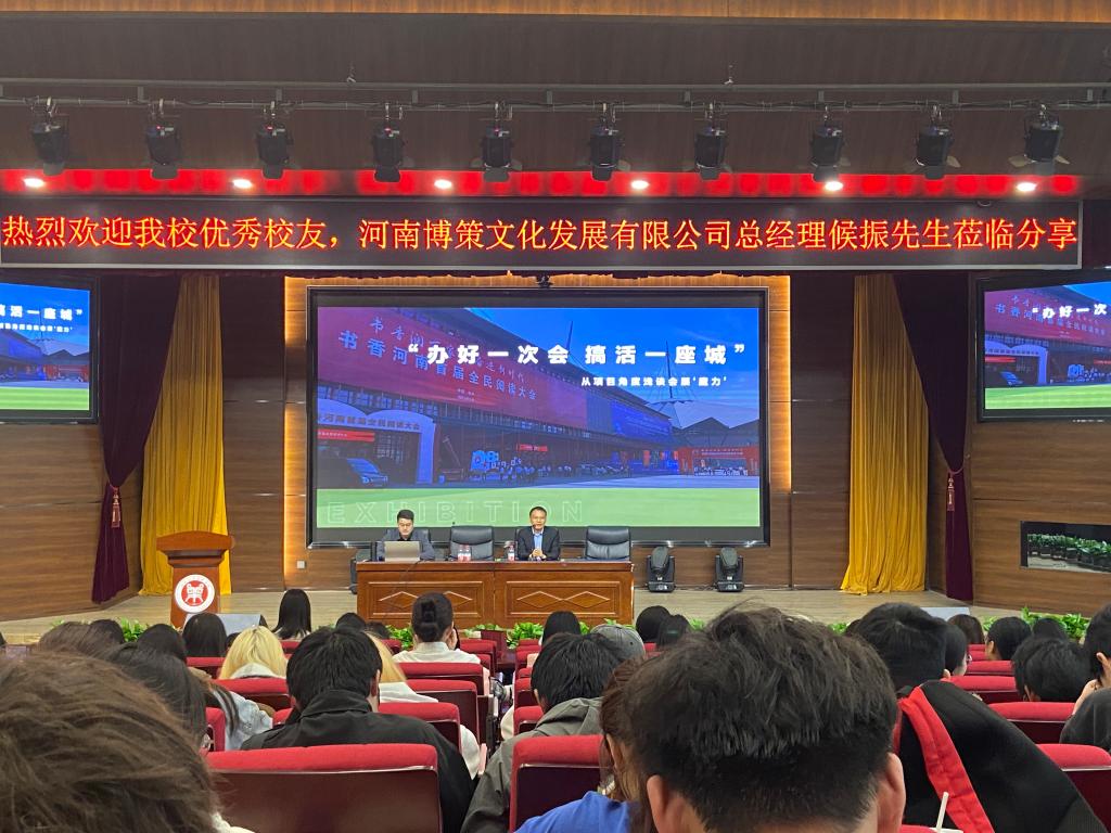 4月8日下午,资深会展人、郑州国际会展中心总经理揭开宇、Beat365官网优秀校友、河南博策文化传播有限公司总经理候振走进Beat365官网,在一号教学楼合100报告厅为Beat365官网师生带来精彩分享,Beat365官网副院长王中雨、会展教研室全体教师、2023级会展专业全体学生130多人全程参加分享交流。