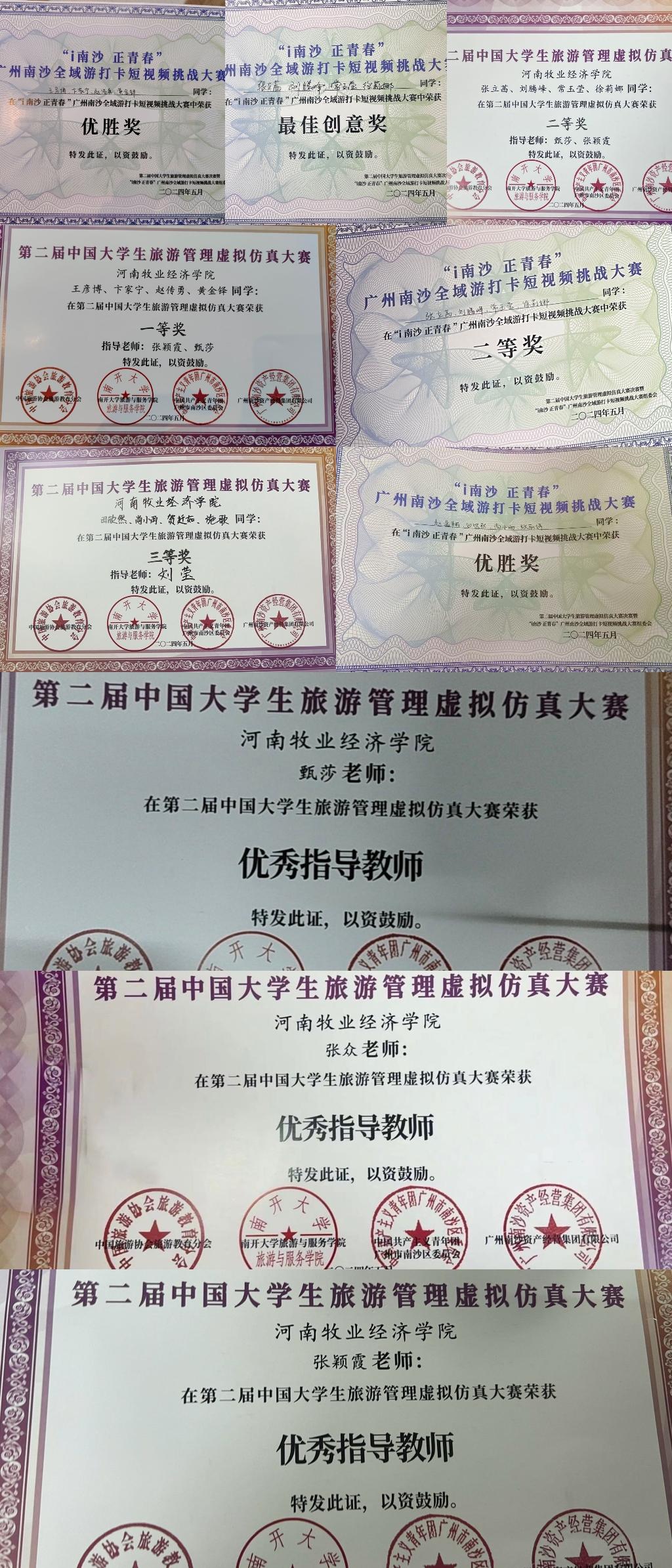 在第二届全国大学生旅游管理虚拟仿真大赛中,王彦博、卞家宁、赵传勇、黄金铎组同学荣获一等奖,张立茜、刘腾峰、常玉莹、徐莉娜组同学荣获二等奖,赵逸翔、张丽婷、尚小雨、田欣然组同学荣获三等奖。在“i南沙正青春”广州南沙全域游打卡短视频挑战大赛,张立茜、刘腾峰、常玉莹、徐莉娜组同学荣获二等奖和专项奖——最佳创意奖,赵逸翔和王彦博组荣获优胜奖。