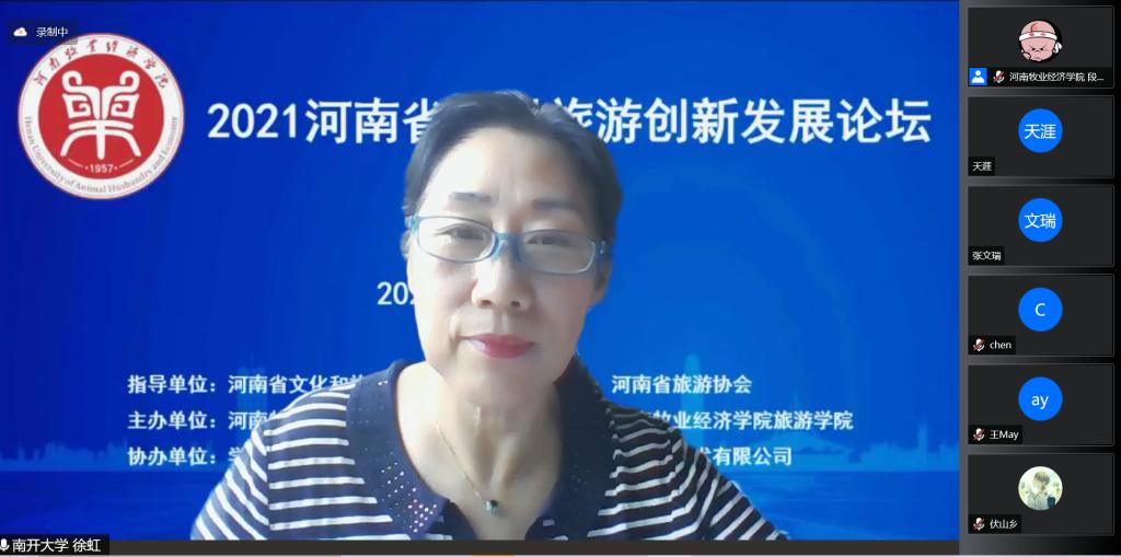 南开大学休闲农业与乡村旅游研究中心主任、博士生导师徐虹教授做了《乡村振兴与旅游产业创新发展的再思考》主题演讲。徐教授关于乡村旅游建设“四生和谐系统”、“123456”发展策略等理论引发了与会者极大的兴趣;关于河南省应积极发展研学、度假、康养和体育旅游的建议,对河南乡村旅游创新发展大有裨益。