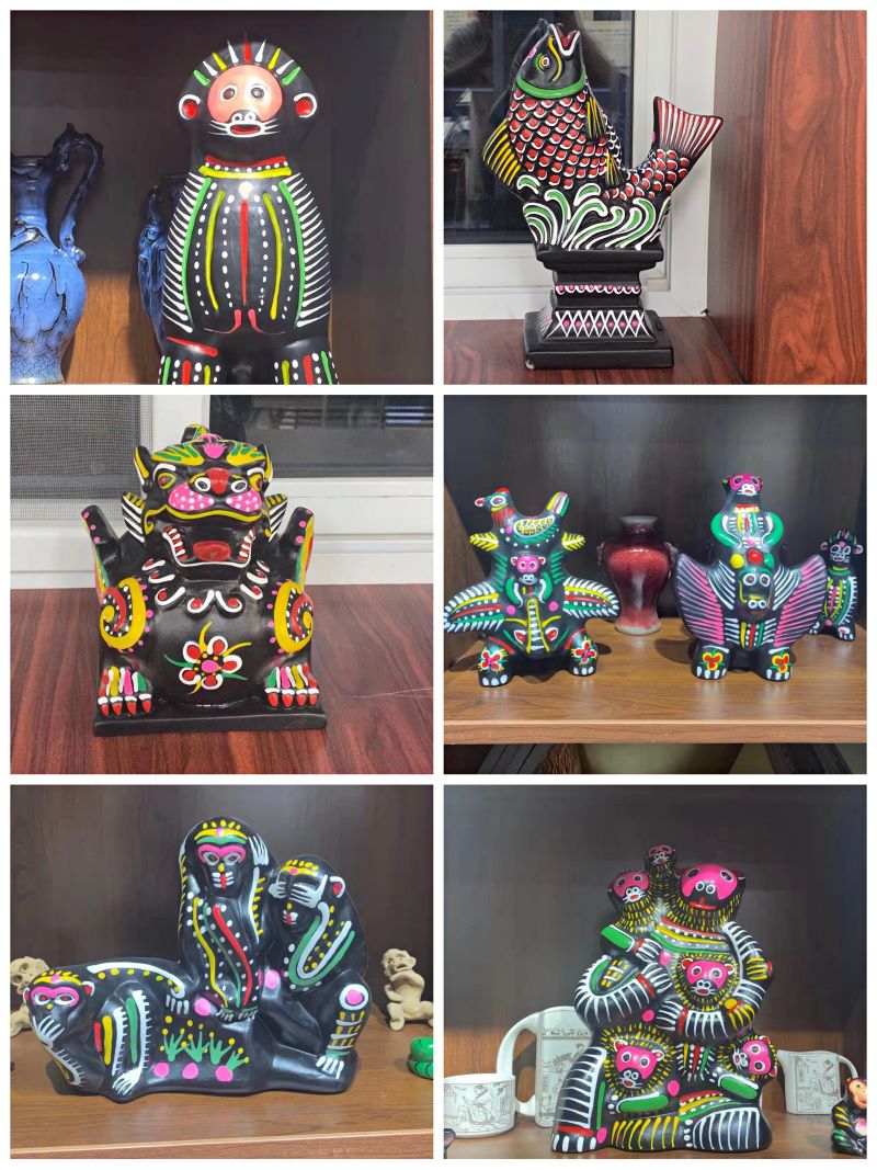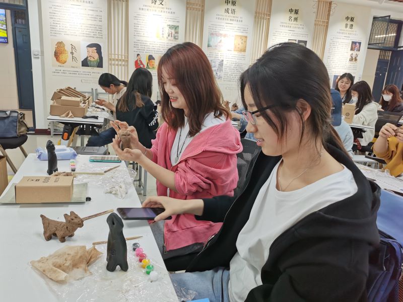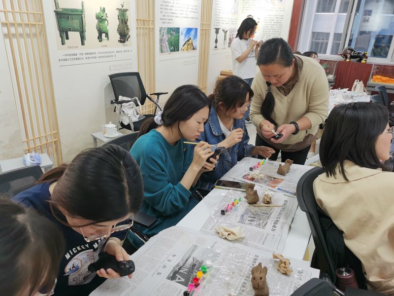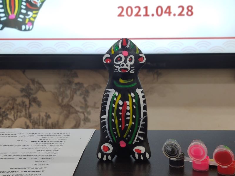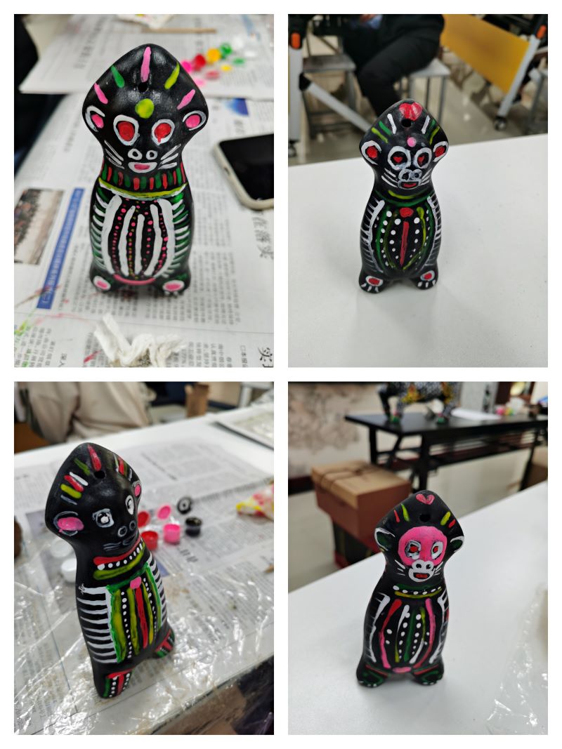 在听完邵波先生的讲述之后,在场同学都饶有兴趣、迫不及待地要制作属于自己的泥泥狗作品。在捏塑的过程中,同学们发现捏出简单的造型并不容易。不同于普通的陶艺手工,泥泥狗讲究一块泥捏成,强调方圆结合的哲学理性,铿锵有力、斩钉截铁的艺术风格。尤其是泥泥狗的上色环节更是有所讲究,以黑色为基调,再饰以红、青、黄、白,体现了中华民族的由来已久的五色观,同学们在具体参与过程中详细了解了非遗,通过捏制、塑形、上色,制作的泥泥狗形态各异,色彩斑斓,代表着他们对泥泥狗的理解和自己的创意。最后,邵波先生对大家的作品给予细致的点评,并对大家的创意给予肯定,鼓励大家要积极走进非遗,学会欣赏艺术品,真正领略民间艺术和传统文化的魅力。