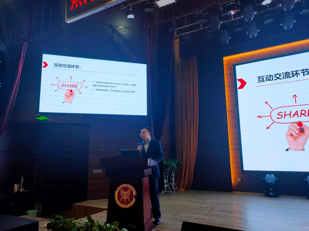 王振宏总经理在介绍了酒店成长发展的职业变化经历后,从职业经理人应具备的四种能力、三种素质以及一种态度三个方面详细地讲解了酒店职业经理人应有的素养。互动交流环节,王总经理谈到了疫情常态化形式下酒店行业发展前景、酒店从业人员素质要求和人才流动、酒店内部管理层男女性别比例问题。王总经理在分享时提到,酒店从业者想要得到更好发展,在大学期间掌握好基础知识至关重要。要注重积累实践经验,转变心态积极迎接挑战,不断提升学习能力和应对问题的能力,并就以后大家对酒店行业工作方向的选择给出了中肯建议。
