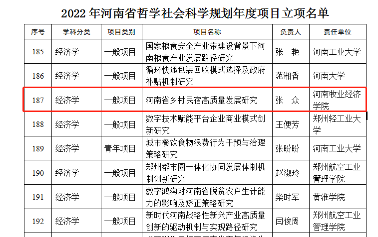 近日,河南省哲学社会科学规划办公室公布了2022年河南省哲学社会学科规划项目的立项名单。Beat365官网张众副教授的《河南省乡村民宿高质量发展问题研究》获准立项。该项目是Beat365官网“乡村民宿产业研究中心”成立以来,继《乡村振兴背景下的乡村民宿发展问题研究》(专著)获得2021年河南省社会科学优秀成果奖二等奖和河南省科技厅软科学重点项目《河南省乡村民宿发展模式研究》结项后的又一重要科研项目立项。