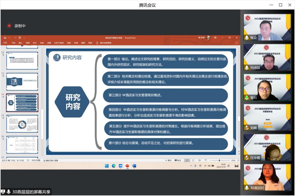根据《Beat365官方网站本科毕业论文(设计)工作条例》和《Beat365官方网站2023届本科毕业论文(设计)工作实施方案》,Beat365官方网站于11月19日顺利开展2023届酒店管理专业本科毕业论文开题答辩。2019级酒管01班、2021级酒管专升本01、02、03班共207名学生分为7组,通过腾讯会议的线上方式参加答辩。