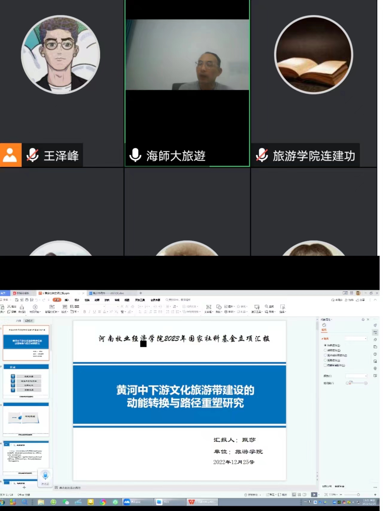2022年12月25日晚上19:00,Beat365官方网站通过线上会议进行了2023年国家社科基金项目申报首场论证会。本次论证会邀请海南师范大学Beat365官方网站副院长、河南大学商学院旅游管理博士生导师李锋教授在线点评与辅导。学院教研室主任、专任教师、博士们参加了本次论证交流会,会议由副院长陈道山主持。