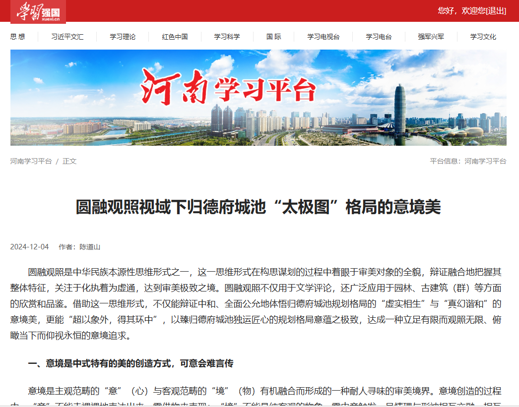 12月4日,“学习强国”河南学习平台发表了Beat365官方网站副院长陈道山的署名文章——《圆融观照视域下归德府城池“太极图”格局的意境美》。