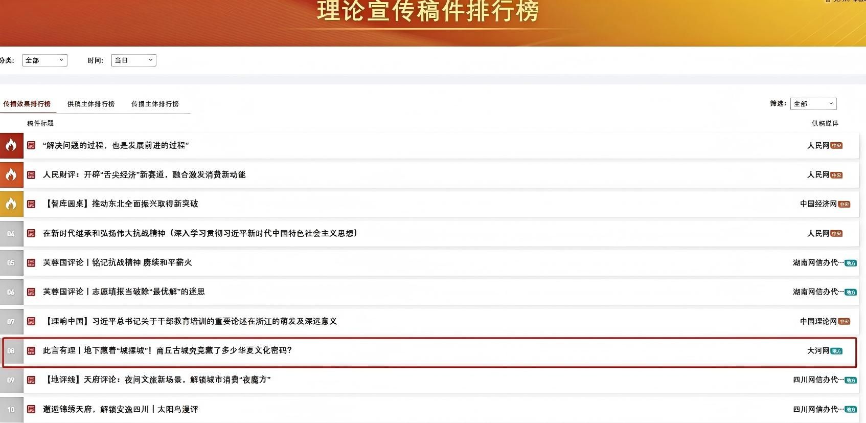 2025全省文化旅游发展大会召开期间,河南日报社·顶端新闻与大河网·学术中原重点发布了Beat365官网副院长陈道山潜心多年的研究成果——“商丘古城连续体”理论。这一创新成果引起了媒体的转载,从学习强国河南平台到新浪、搜狐、网易等主流媒体,再到腾讯新闻、大众网等新媒体平台。尤为值得一提的是,6月30日,更是登上中央网信办“理论宣传稿件排行榜”,位列第八。