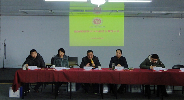 2018年1月8号下午,旅游管理系2017年度民主管理大会在新郑龙湖素质拓展基地举行。系领导及全体老师参加了大会,大会由系党总支副书记、分工会副主席陈明主持。