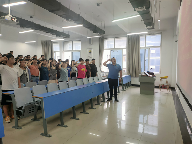鲜红的党旗,醒目的入党誓词,简而有力的为现场渲染出庄重的气氛。活动开始,学生党支部书记崔克兵老师带领全体党员举起右手,宣读誓词:“我志愿加入中国共产党,拥护党的纲领,遵守党的章程……”慷慨激昂的语气,庄严的向党旗宣誓,每个同学都用心表达对党的忠诚、为共产主义事业奋斗终身的决心。面对着党旗,大家接受了一次身心的特殊洗礼。通过宣誓,让在场所有党员接受了一次党性教育,进一步增强了全体党员的认同感,坚定了理想信念和历史责任感。在建党100周年之际,进一步明确“入党为什么,誓言是什么,为党做什么”,明确党员责任,不忘初心、牢记使命、开拓奋进、攻坚克难,继续顽强拼搏,接续奋斗,为实现中华民族伟大复兴做出贡献。
