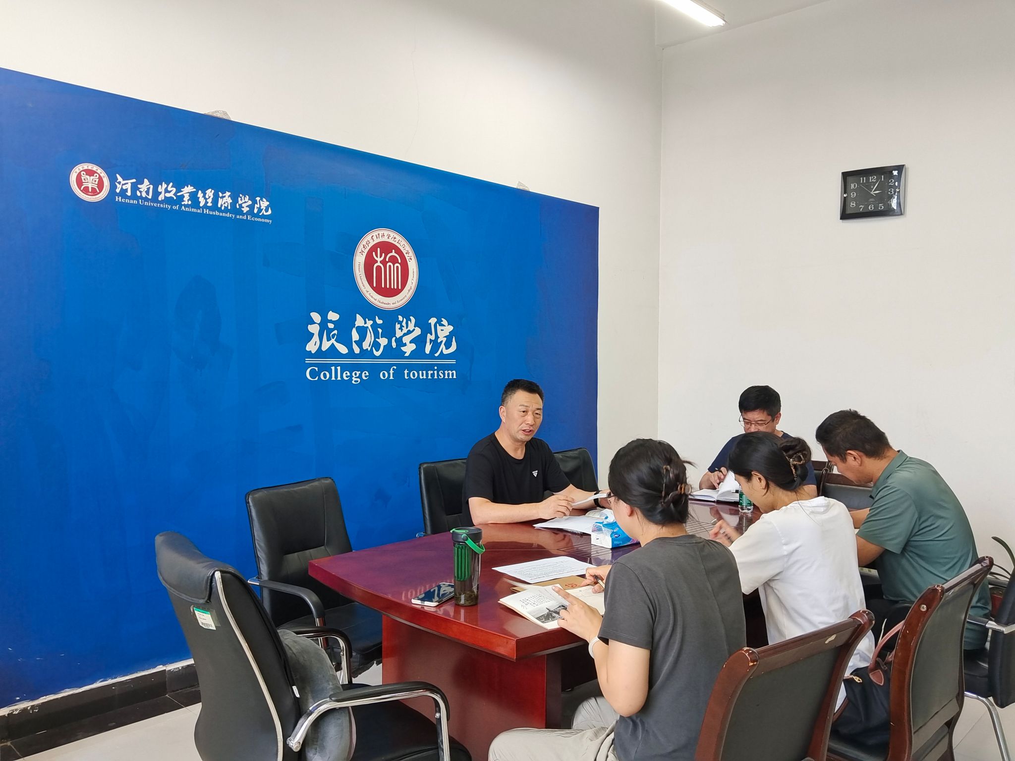 7月29日下午,旅游学院党委在号教学楼406会议室召开理论学习中心组(扩大)学习研讨会领导班子成员党支部书记参加会议,会议由院党委书记权太举主持。
