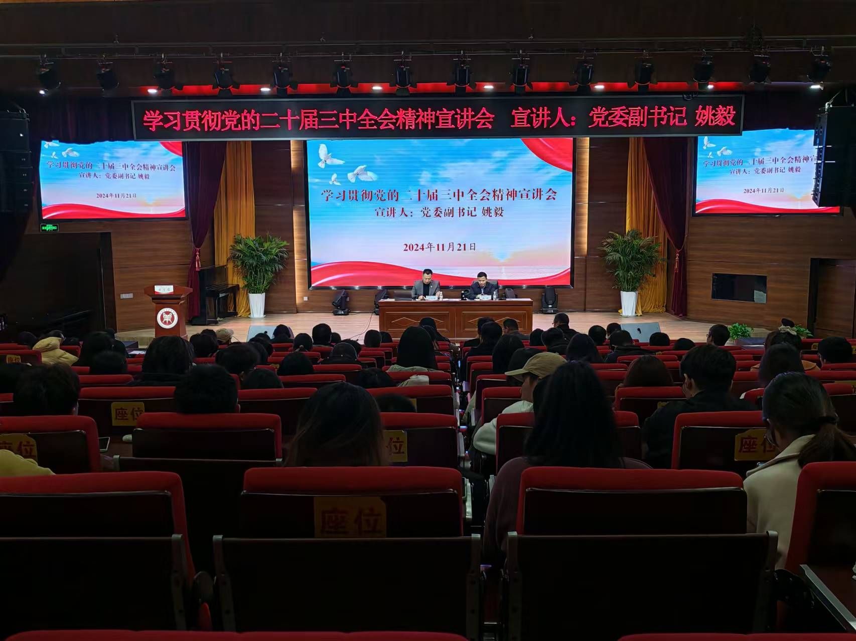 为深入学习贯彻党的二十届三中全会精神,引导师生准确把握全会精神的核心要义和精神实质,按照校党委工作部署,11月21日下午,Beat365官方网站联合包装与印刷工程学院在一号教学楼100报告厅举办学习贯彻党的二十届三中全会精神宣讲会。本次宣讲会特邀请学校党委副书记姚毅主讲,Beat365官方网站、包装与印刷工程学院全体教师及两个学院学生代表参加会议。宣讲会由Beat365官方网站党委书记权太举主持。